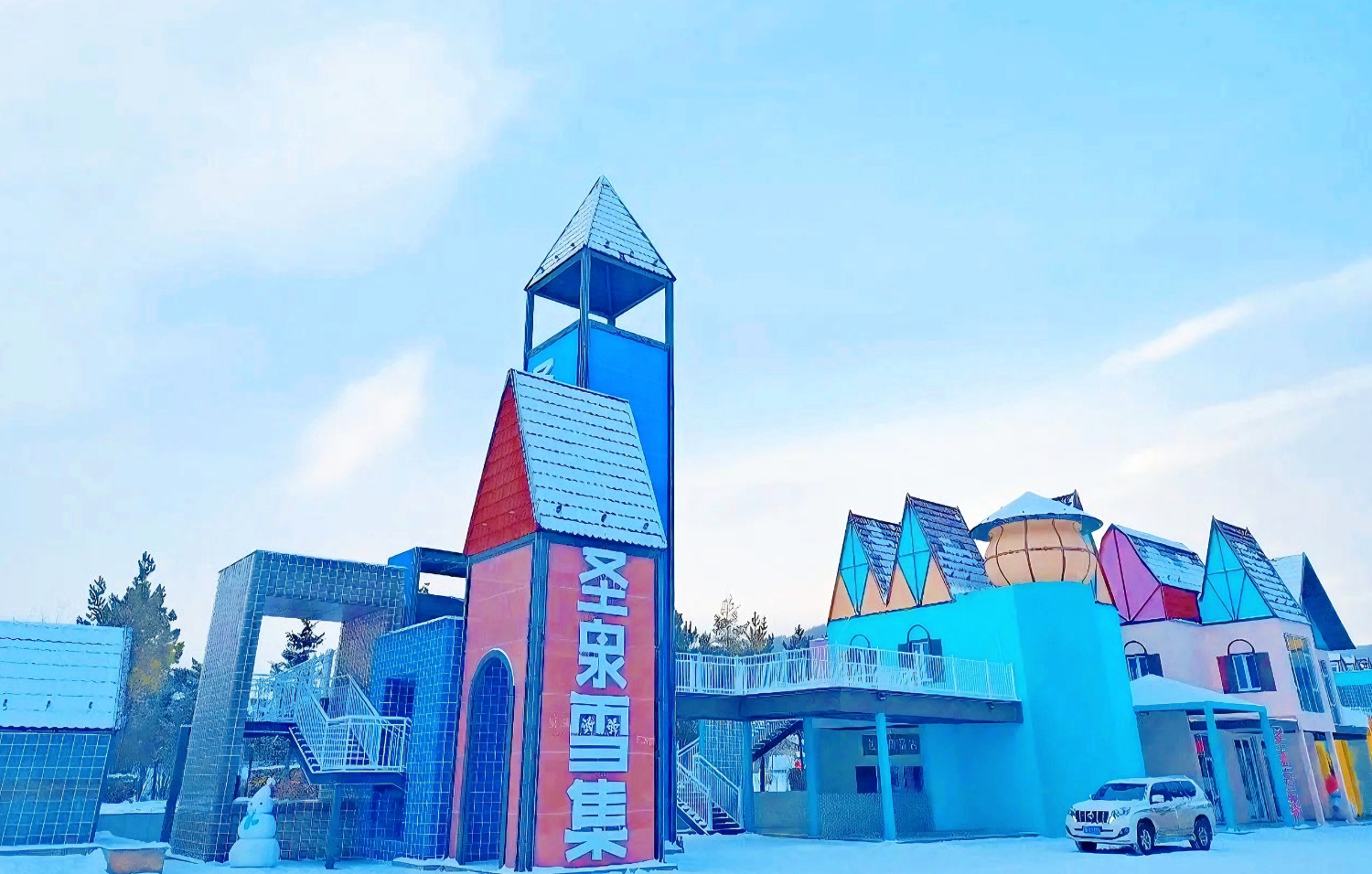 玩累了,就到圣泉雪集 “充个电”!一排排童话风的小屋中,藏着香醇的牛肉干、热腾腾的奶茶等地道美味,还有冰箱贴、树皮画等特色文创小物,等你来慢慢淘。