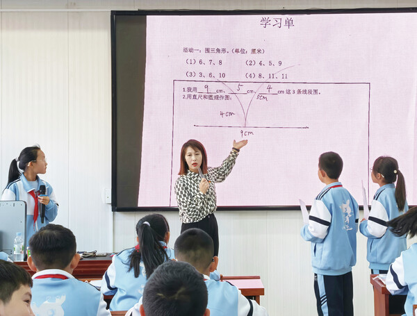 “数学是思维的体操,而语言是思维的外壳。学习,讲清楚了才是真理解,真理解才会促进思维发展。”在接受采访时,杨玉花阐述着她的教学理念。作为数学教师,她认为,发展思维是数学核心素养最核心的学科表达。在她的推动下,数学课堂正悄然发生着变革。教师不再是唯一的知识权威,而是学习的组织者、引导者与合作者。她的课堂强调“以学定教,顺学而导”,将学习的主动权交还给学生。“转变学习方式,不仅是认知层面的更新,更需要一个实实在在的平台。”为此,杨玉花特别建议在每节课的关键处、学生思维培养的核心环节,设置5至7分钟的生生互动时间。“以学定教,顺学而导”不再是一句理念,而是化作了真实的教学实践,学习的主动权被郑重交还给每一位学生,让他们从知识的被动接收者真正成为课堂的主人。而这份“主动权”,让学生发生了肉眼可见的蜕变:曾经课堂上低头沉默的身影少了,主动举手分享解题思路的孩子多了;面对复杂题目时的胆怯少了,围绕难点与同伴激烈讨论、甚至主动提出质疑的勇气多了。就连往日对数学略显畏惧的学生,也渐渐在小组互动中找到了表达的自信,从“不敢说”到“试着说”,再到“主动说”,每一步都藏着成长的惊喜。