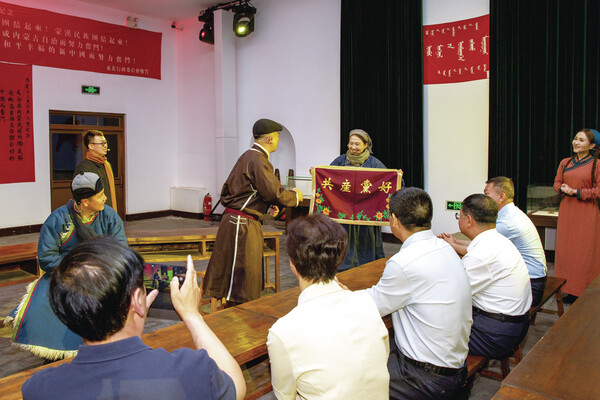 在乌兰浩特市五一北路,一面青砖墙上的“五一会址”四个金色大字熠熠生辉。展厅内,由兴安盟乌兰牧骑队员们表演的沉浸式情景剧《五一大会》正在火热上演。这部剧以1947年内蒙古自治政府成立大会为创作背景,生动再现了那段波澜壮阔的光辉历史。