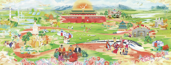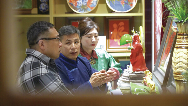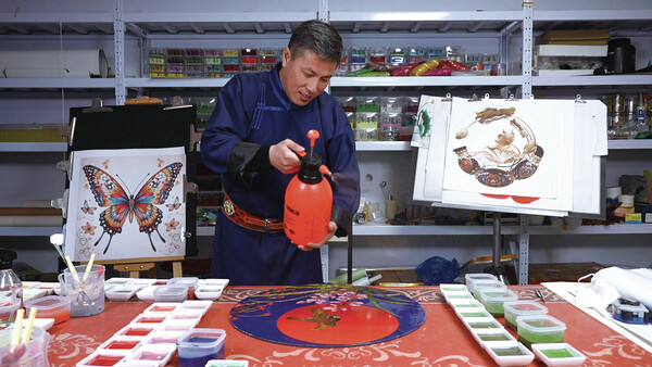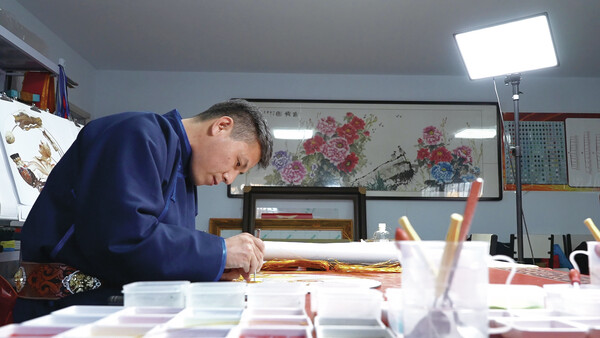 真正的传承,从来不是简单的复制,而是让古老技艺在与当代对话中,生长出新的生命力。在做好技艺传承的基础上,张海大胆突破桎梏,推动景泰蓝技艺与时俱进。他将现代工艺画流程与传统景泰蓝工序深度融合,摒弃单一的平面展示形式,创作出具有立体动态效果的掐丝珐琅画,在保留了景泰蓝的材质美感的同时,也让古老工艺焕发出新生机。在文化交融方面,他用蒙古族的传统纹样勾勒现代景观元素,以京绣的细腻笔触描绘草原的粗犷之美。张海创作的大型主题壁画《站在草原望北京》,既保留了景泰蓝的经典韵味,又赋予了作品鲜明的时代内涵与地域特色,让古老技艺真正“活”在了当下。