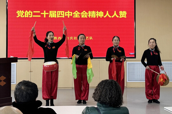 在铁西街办事处吉庆社区“宣讲+文艺”融合讲堂上,社区文艺队表演的三句半刚结束,宣讲员便接续解读:“咱‘铁西网格树’服务体系去年解决了150多件民生难题。全会提出推进基层治理现代化,今后办事会更快、更准、更贴心!”