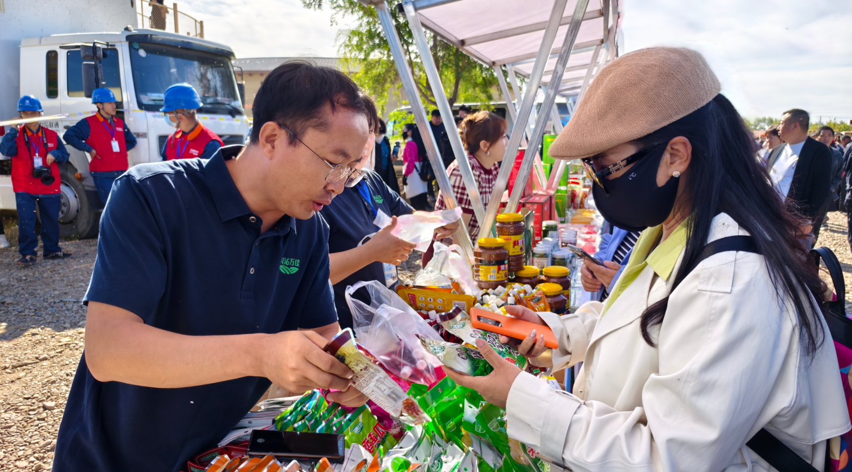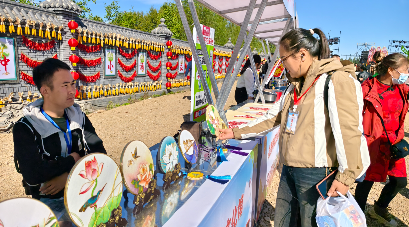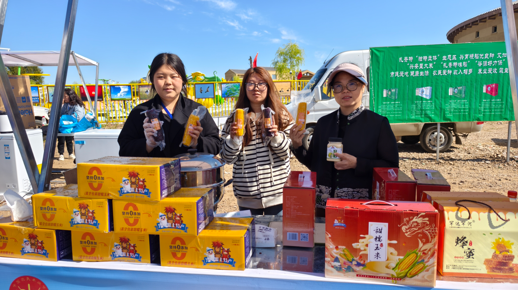 “我们今天展出了科沁万佳品牌的40余种产品,包括零添加的酱油、各种酱料和小菜,送礼物也可以选择礼盒装。”“我们展出的是扎旗努文木仁乡杏花村出产的生态大米,我们的大米不仅在兴安盟售卖,还走上了青岛、大连人的餐桌。”在土特产展区的每个展位前人头攒动,奶制品、林果采摘品、粮油产品……来自全盟各地的农牧产品汇聚一堂,为游客们带来了一场空前的“丰收盛宴”。