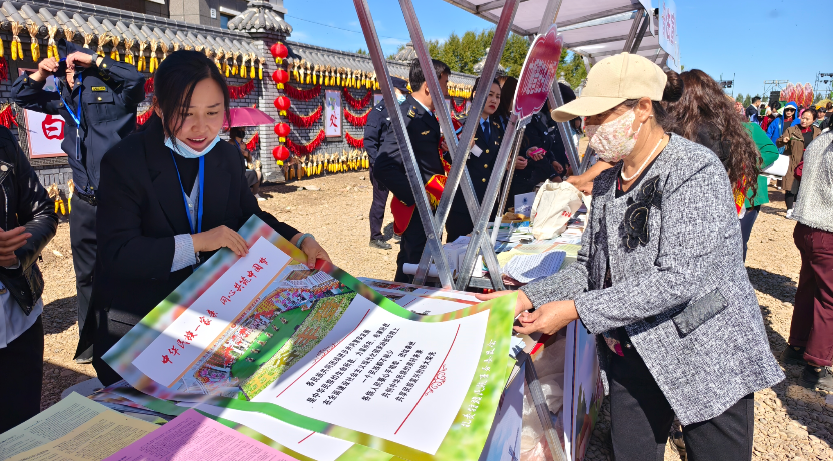 在扎赉特旗民族事务委员会的宣传展位上,工作人员正在为现场群众讲解《内蒙古自治区促进民族团结进步条例》等相关法律法规。“我们准备了铸牢中华民族共同体意识的主题海报送给现场群众,希望借助丰收节的契机进一步宣传民族团结。”现场工作人员曙光表示。