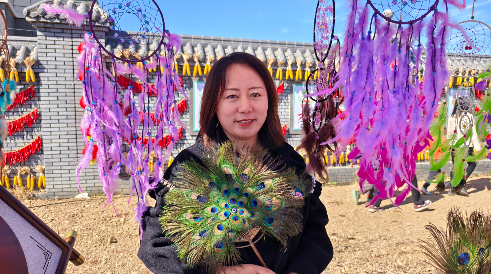 现场还有优秀劳务品牌展示,来自乌兰浩特市的蒙雀养殖专业合作社带来了他们最引以为傲的产品——孔雀羽毛工艺品,吸引了许多游客驻足。“我们的产品包括孔雀羽毛制作的耳环、胸针、扇子、挂饰等。”合作社副理事长周海南介绍说,“我们会定期开设培训班,免费为附近农户开展羽毛工艺品制作技艺培训,目前累计培训了3600多人次。”