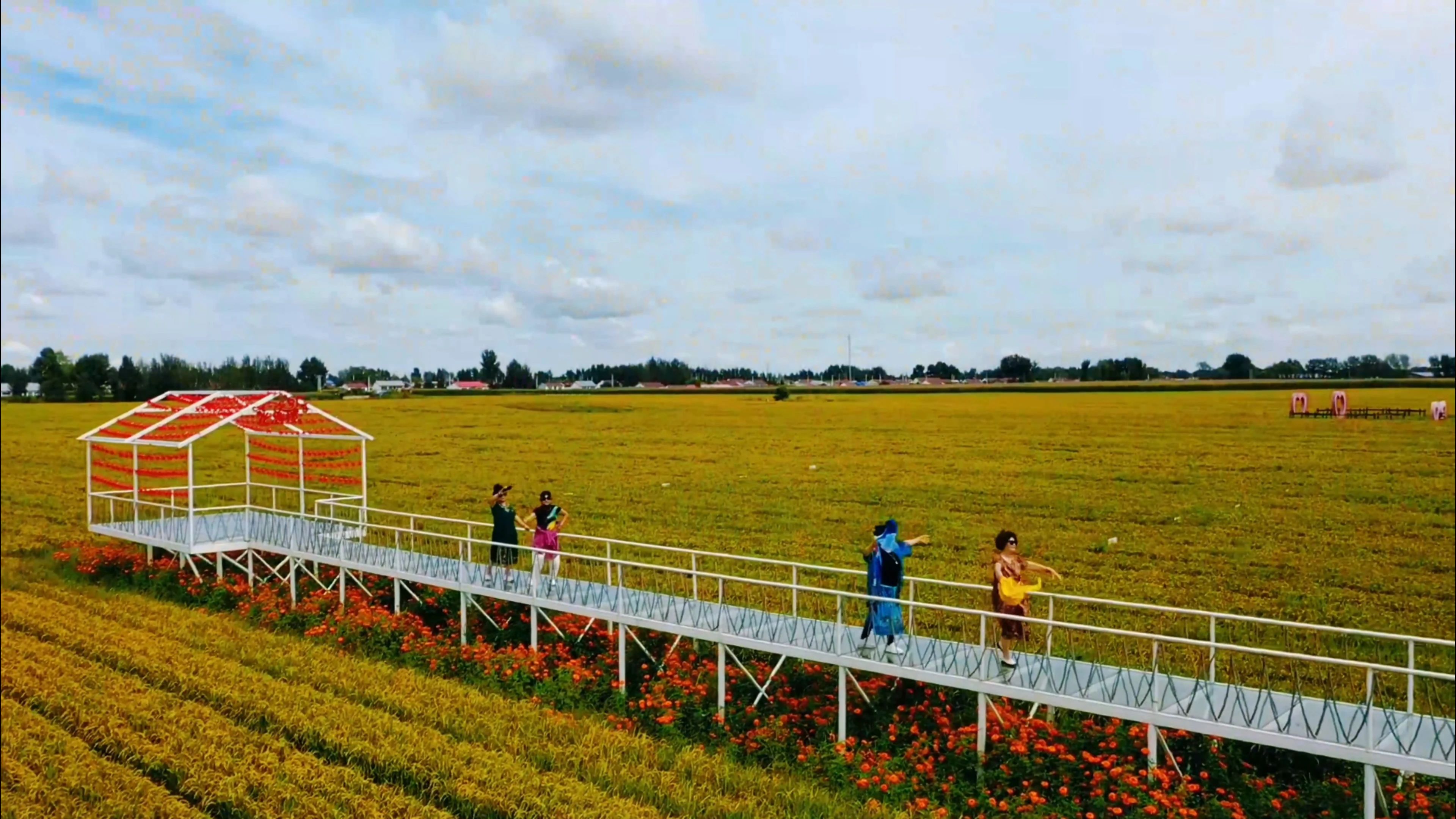 爱情栈道依着现代农业而建,两旁是金黄的稻田和五彩斑斓的树木,漫步其间,每一步都踏着浪漫与温馨。