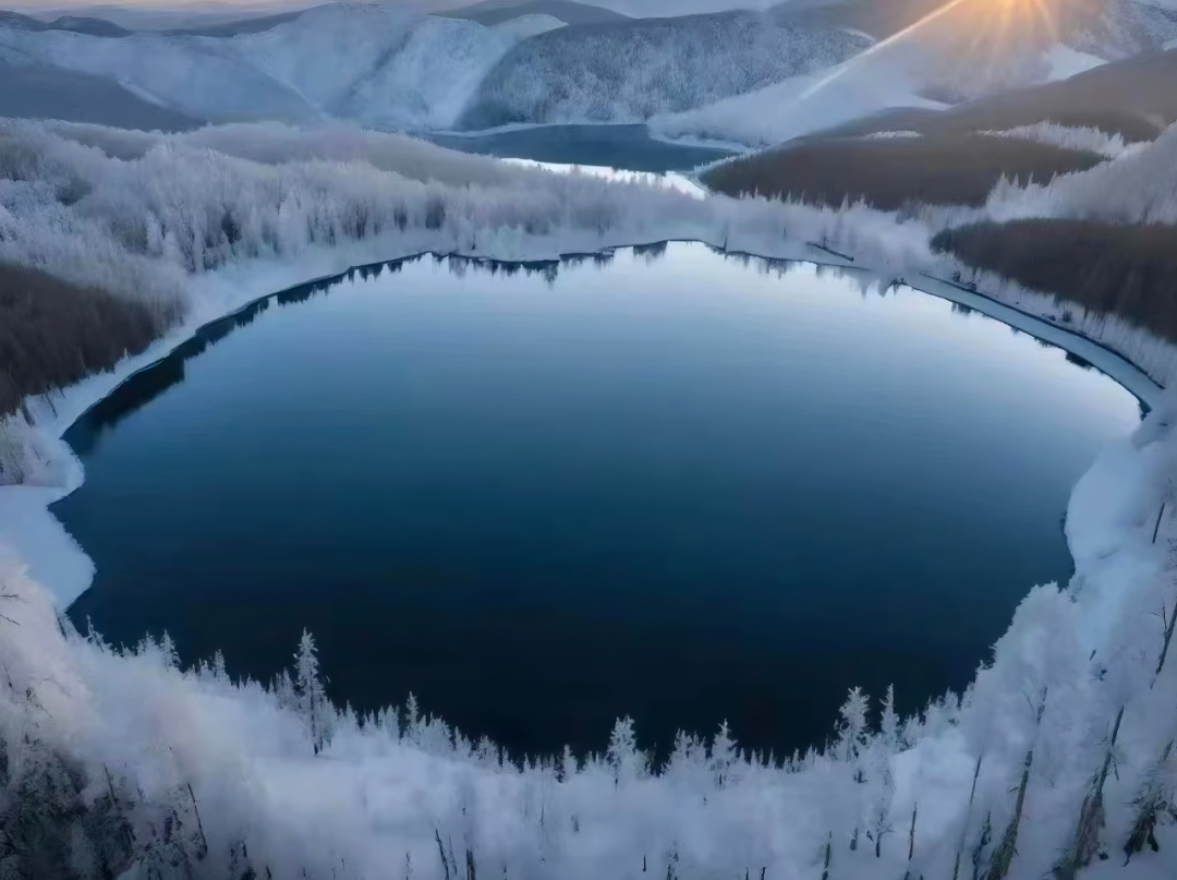 雪覆群山,天池静卧其间,宛如地球在冬日里睁开的眼眸,冰雪虽凝住了往日的波光,却沉淀出沉静圣洁的气质。雾凇环绕,风来时,雪片簌簌而落,好似置身空灵仙境。