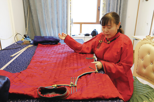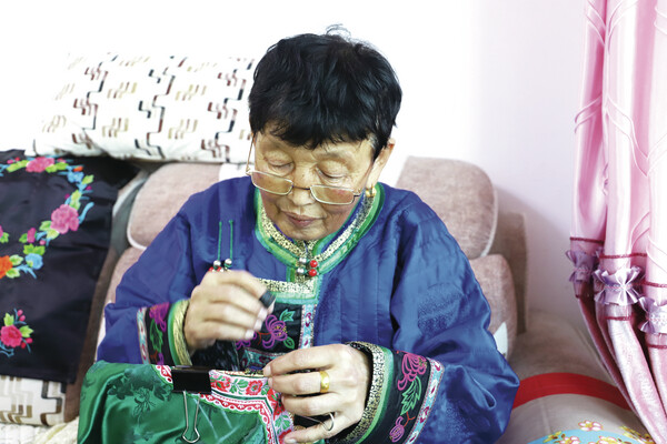 同样的暖阳穿透玻璃窗,落在乌兰毛都草原的一间民俗工作室里。70岁的胡吉雅端坐于铺着蓝色哈达的工作台前,银针在红色绸缎间穿梭,金丝线随指尖跃动,一朵牡丹纹样渐次成形。“这是新娘的嫁衣,缝了两个多月了,把最后的盘扣缝上,就完工了。”老人用不太流利的汉语开心地说,眼角皱纹里盛着笑意,银白发丝在阳光下泛着暖光。