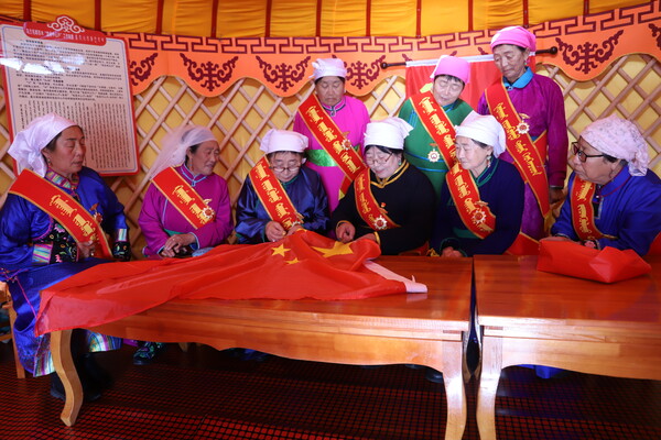 德力黑接过话茬,语气里满是骄傲:“我们都是当年的‘草原铁姑娘’,年轻时跟着集体放牧、劳作,啥苦都吃过。如今老了,还能攥着这绣花针,把对幸福生活的感受绣进红旗里,把这门手艺传下去,心里头敞亮着呢!”
