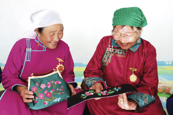 冬日的暖阳洒在乌兰毛都草原的毡房前,71岁的门斯乐和德力黑两位老阿妈正并排坐在炕沿上,指尖翻飞间,彩线在素色绸缎上穿梭游走。家离得近,又同为札萨克图刺绣非遗传承人,这样切磋技艺的场景,早已是她们生活里的常态。