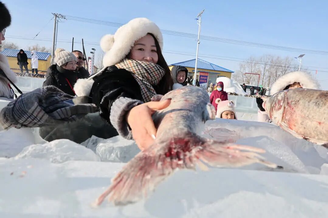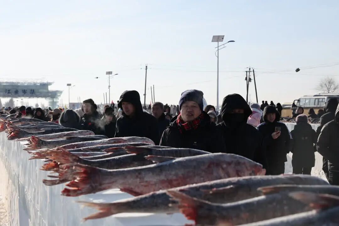 与赛场上的激情澎湃相映成趣的,是江鱼市集上热气腾腾的丰饶图景。得益于嫩江、绰尔河、雅鲁河三江交汇的慷慨馈赠,努文木仁乡水下物产丰饶。百米冰台上,“三花五罗十八子”“七十二杂鱼”等特色江鱼整齐陈列,鳞光闪烁,宛如一部冰封的江鱼文化史诗。“咚!”随着一声清脆的锣响,头鱼拍卖环节将这场自然馈赠的盛宴推向高潮。此起彼伏的喊价声里,既有讨个好彩头的期许,更是对当地特色江鲜的认可。