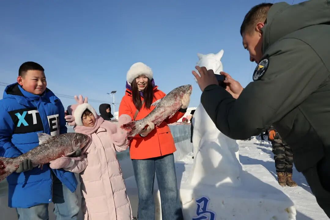 市集一侧,一口口大锅支在冰天雪地间,铁锅里江鱼正咕嘟翻滚,热气裹挟着浓郁的鲜香扑面而来。掌勺师傅一边挥动锅铲,一边招呼:“来,都尝尝铁锅炖江鱼,嘎嘎香!”除了这口舌尖上的热闹,现场还设有冰玫瑰墙、十二生肖雪雕、东北话艺术字墙等打卡点,搭配冰车、雪圈等娱乐项目,让每位游客都能沉浸于这片冬日乐趣。“活动又多又热闹,我还免费品尝了铁锅炖和黏豆包,特别好吃!”齐齐哈尔市游客许文浩连连称赞。