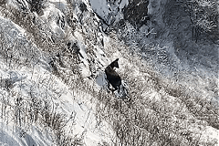 近日,在兴安盟白狼林业局光顶山林场的白狼峰景区内,工作人员于海拔1500余米的雪域山岩间意外发现了国家一级保护动物林麝的活动踪迹。这只林麝体态轻盈、行动敏捷,穿梭于灌丛与岩壁之间,其深色皮毛在皑皑白雪中格外显眼。